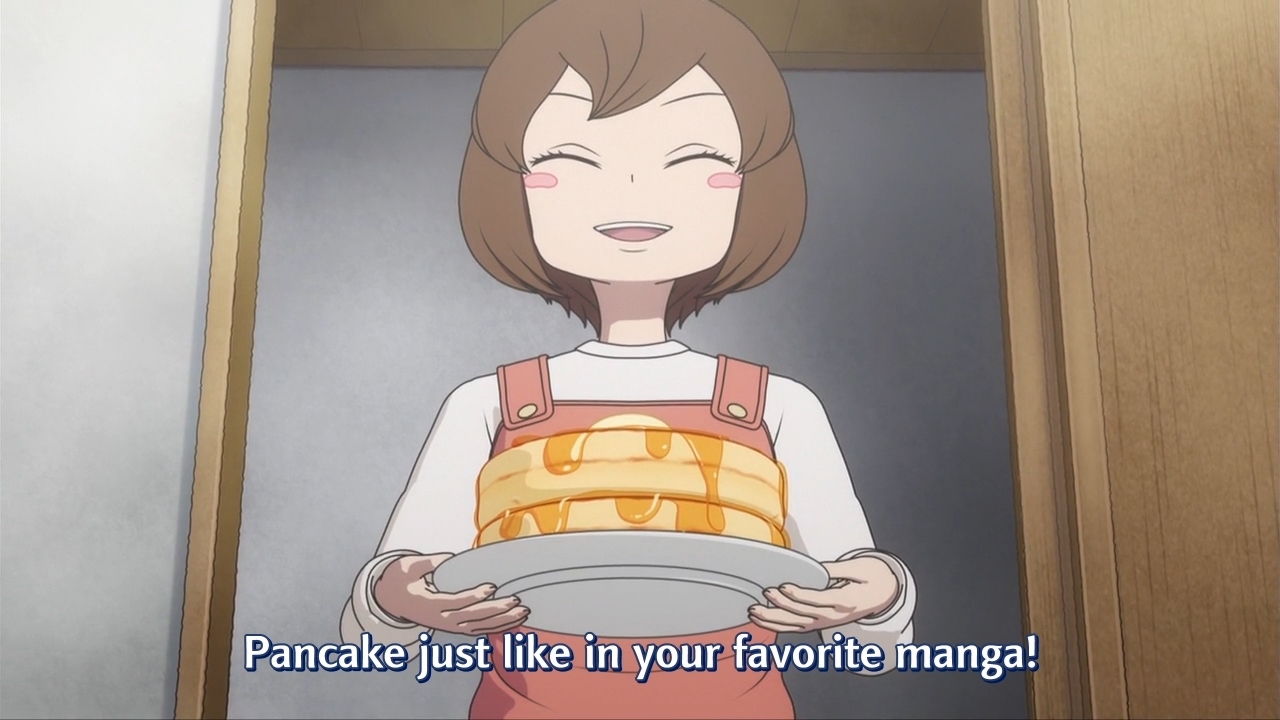 — Haruo’s mom drops by with a tall stack of pancakes. Man, Haruo doesn’t realize what a boon he has. Lots of girls would love to have a mother-in-law that they can get along with.