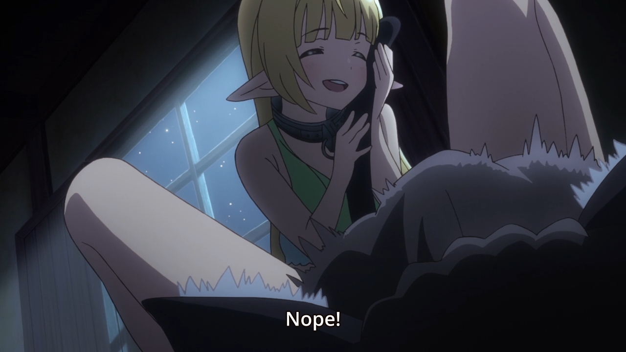 — There’s one more significant harem-y scene in the episode: after Shera and Rem bond with each other, the elf girl decides to get a little more intimate. Again, unwanted touch between girls is A-OK in anime!