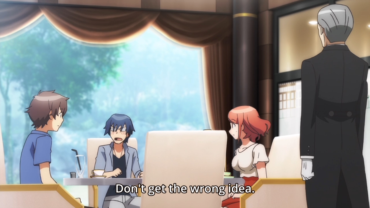 — It’s a long, boring scene. First, Satsuki orders a lot of desserts. Second, Takanori thinks that a super secretive guild out there is pulling all the strings! They can even scare you into keeping quiet in real life! Oooooh! Remember, kids, MMORPGs are serious business. Third, all of their gear was gone when they logged into Re’Union! What’s up with that! Fourth, Takanori thinks Asahi’s body is still being kept alive out there! Last but not least, Takanori has been trying to locate Nozomi, because he’s mega tsundere! Phew, we’re all done. One long, boring exposition scene out of the way.