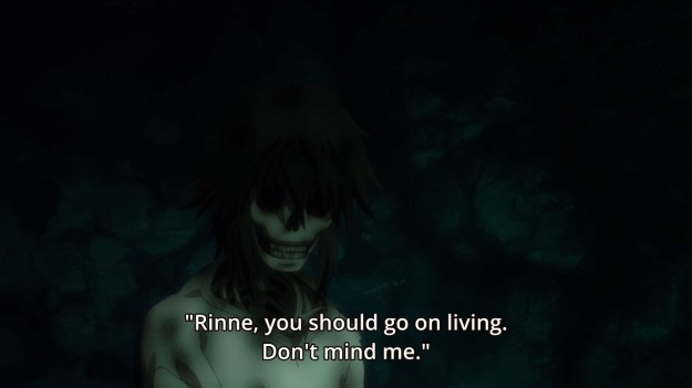 Not that the story was any good to begin with, but I felt like it really jumped the shark this week. Our Setsuna and Rinne end up back on that very same island, but they didn’t manage to travel through time or anything. As a result, Rinne’s Setsuna is long dead. He’s nothing more than a skeleton sitting in a cave… wait a minute, what on earth is this cave? Who put this whole place together? What’s up with this technology? Whatever, we’ll worry about this later. Our Setsuna tries to help Rinne come to grips with the fact that she needs to move on with the rest of her life, and at first, it seems as though he might have just done the trick. But when they tried to return to Urashima, the girl ended up being lost at sea… again. This time, however, she didn’t survive. End of the story, right? Not so fast, my friend!