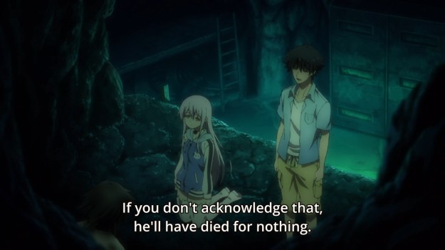Oh yeah, I’m still watching this show. Well, it turns out Inuki had leaked info on the last barrier-destroying mission to the enemy, because he wanted to protect the orphanage that he had grown up in. That’s understandable. Who wouldn’t want to protect orphans? Anyways, Inuki and Jun grew up together, so they’re practically bros. Koume grew up with him too, and she seems resigned to the fact that he isn’t long for this world. Inuki is the result of a failed experiment, which is why he turns into a monster every so often. Since he’s losing his humanity, he wants Jun, his bro, to finish him off. Unfortunately, Chihiro intervenes because he wants to try and save Inuki. I’m not sure how he intended to do so, but since he fails, it doesn’t really matter. What does matter is that Chihiro is in danger of losing himself as a result of failing. Oy vey… this kid really does seem kinda useless. So in the end, Inuki dredges up any last shred of humanity he has left to save Chihiro, and in doing so, it looks as if he’s gone for good? Unless you see a dead body, however, you can never be too sure. But yeah, that about does it for this week’s episode. Chihiro is probably the worst protagonist of the summer season. He’s got no clue what he’s doing. All he does is mope around for two-thirds of the episode, then inevitably screws something up in the remaining third. I’m not sad that I stopped dedicating a post to this abomination of a show every week. I’m sad that I even tried.