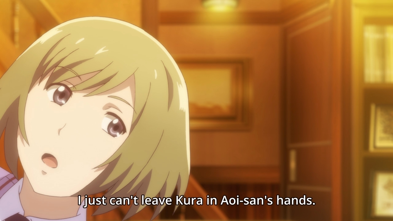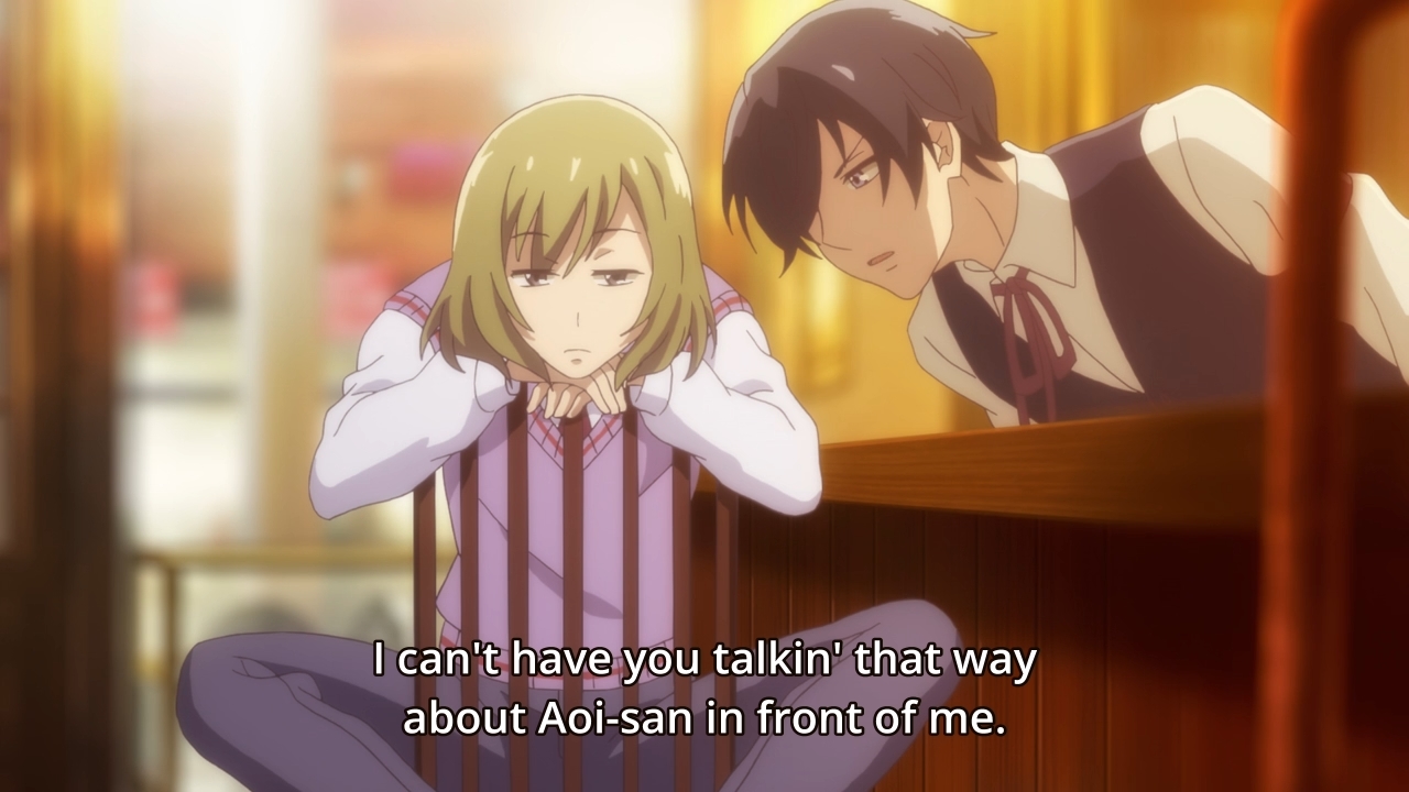In other news, Aoi and Holmes are inching ever so closer to becoming a couple. Rikyu continues to be a jerk, but Holmes doesn’t hesitate to defend the girl. That’s good! And since the kid insists over and over that he’s the best person to work at the shop, Holmes even engineers a scenario where Rikyu is left behind while the rest of the gang attends yet another fancy birthday party. Speaking of which, Aoi ends up winning an amateur art appraising contest, which really impresses the guy. Why? ‘Cause this totally means she seeks out the truth!!! God, Holmes can so dramatic, which leads me to the ending. It looks as though he was about to confess something to Aoi, but they were rudely interrupted by Akihito. As a result, we’ll have to put a raincheck on whatever it is that Holmes wanted to say. But like I said, it looks as though these two are destined to be a couple. After all, he didn’t look too pleased when she said that her friend wanted her to attend a mixer. I’m a bit of a sap, so I won’t lie; I wouldn’t mind seeing some romance in this show. I still have qualms about a graduate student pursuing a high schooler, but cultural differences and all that…