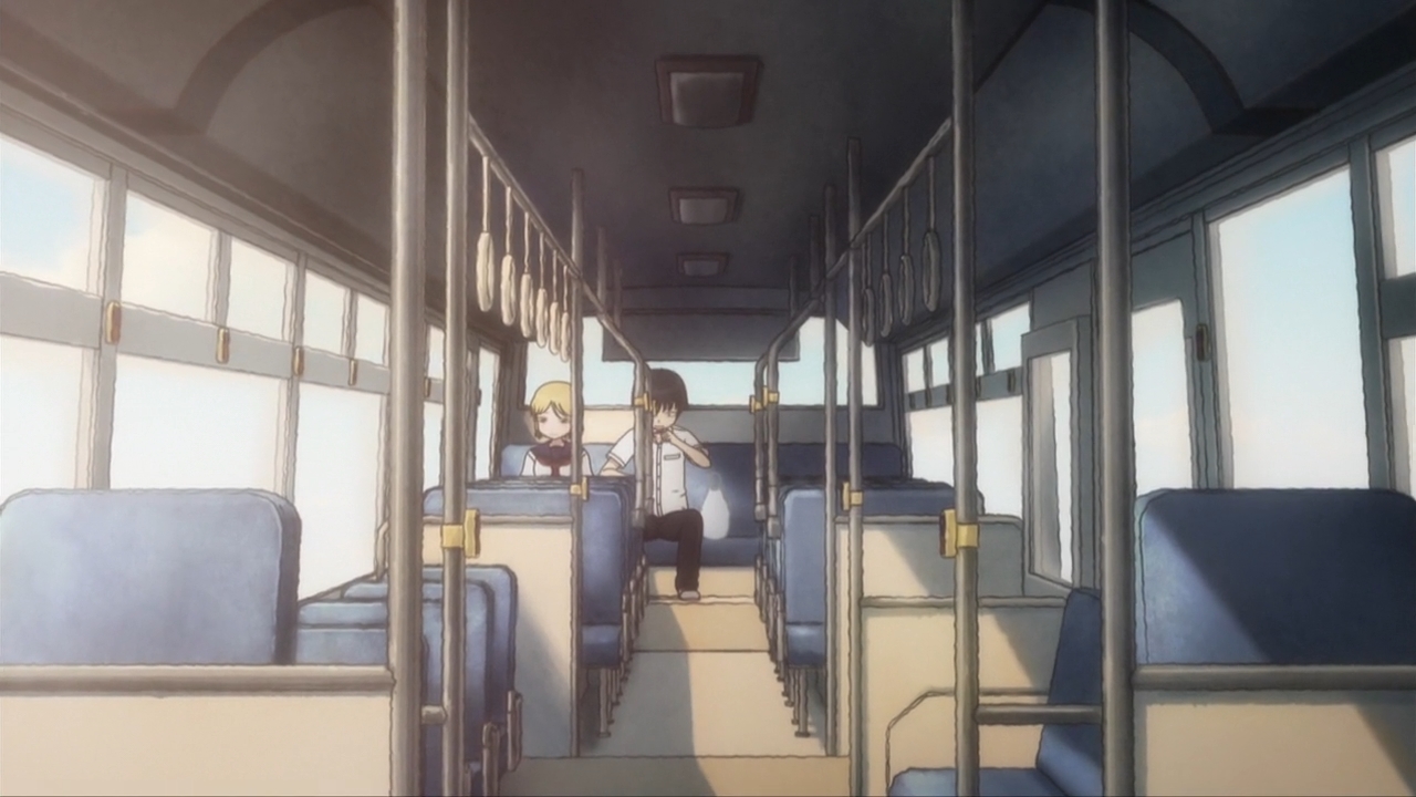 — During a brief stop, Numata, one of Haruo’s teachers, asks him to buy him a drink. The kid takes too long buying too many drinks. He’s trying to be considerate and think of others, but he just keeps shooting himself in the foot. On the plus side, however, Koharu now gets to spend some time with him now that they’ve both been left behind.