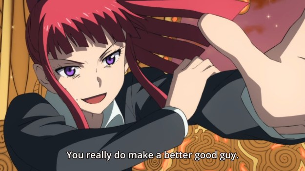 — Be that as it may, Benika is not a great villain. After all, she’s trying to recruit the one former teammate who is least likely to be a baddie. Hideo just looks and sounds like a generic anime good guy, y’know? Not only did she try to recruit the wrong guy, she even tells him how to unlock his powers should he ever need to. It’s almost as if she’s sabotaging herself.