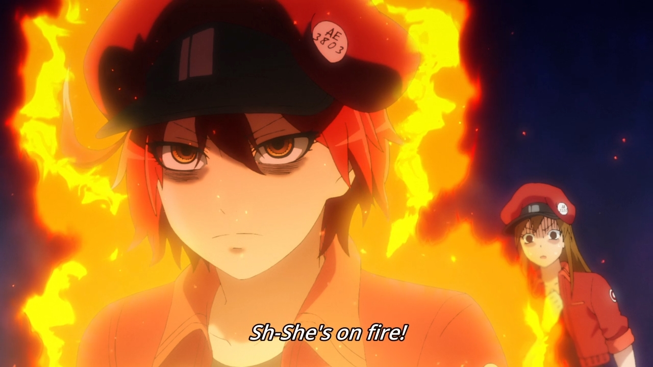 In this week’s episode, Red Blood Cell is determined to circulate without getting lost, so we get to see her go through all sorts of silly obstacles. It’s nice to take a break from all the shounen-esque battles against killer pathogens. What Red Blood Cell doesn’t know, however, is that White Blood Cell is following her every step of the way to make sure that her journey is successful. Then at the end of the episode, we get a cute, little moment where she recounts her adventures to him.