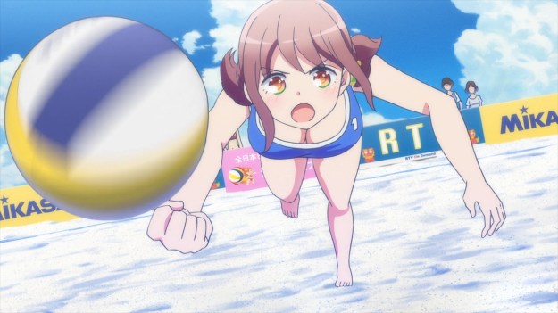Anyways, enough of that nonsense. Even with the top spin serve, the Aragaki sisters lose in straight sets. They also lose pretty badly both times. They’re not too bothered about it, though. Hell, they probably could’ve scored more points if they weren’t so deadset on breaking Haruka’s blocks. So basically, Haruka has learned a lot from Claire, and as a result, her game mirrors the blonde twin. This is why the Aragaki sisters got so fixated with just getting pass her blocks. But Haruka still has Kanata behind her, and blah blah blah teamwork owns. And with their second win under their belt, they just have one match left: the finals against the Thomas twins. This is for all the marbles, boys. Whoops, I meant girls. Silly me, there are no boys on this island. Like I said, there isn’t much to this episode. There isn’t much to this show either. Unlike other sports anime, Harukana Receive doesn’t have the animating chops to show us the action that we desperately crave. That’s why the anime has to rely on slow motion and close-ups all the damn time. It’s just too simple.