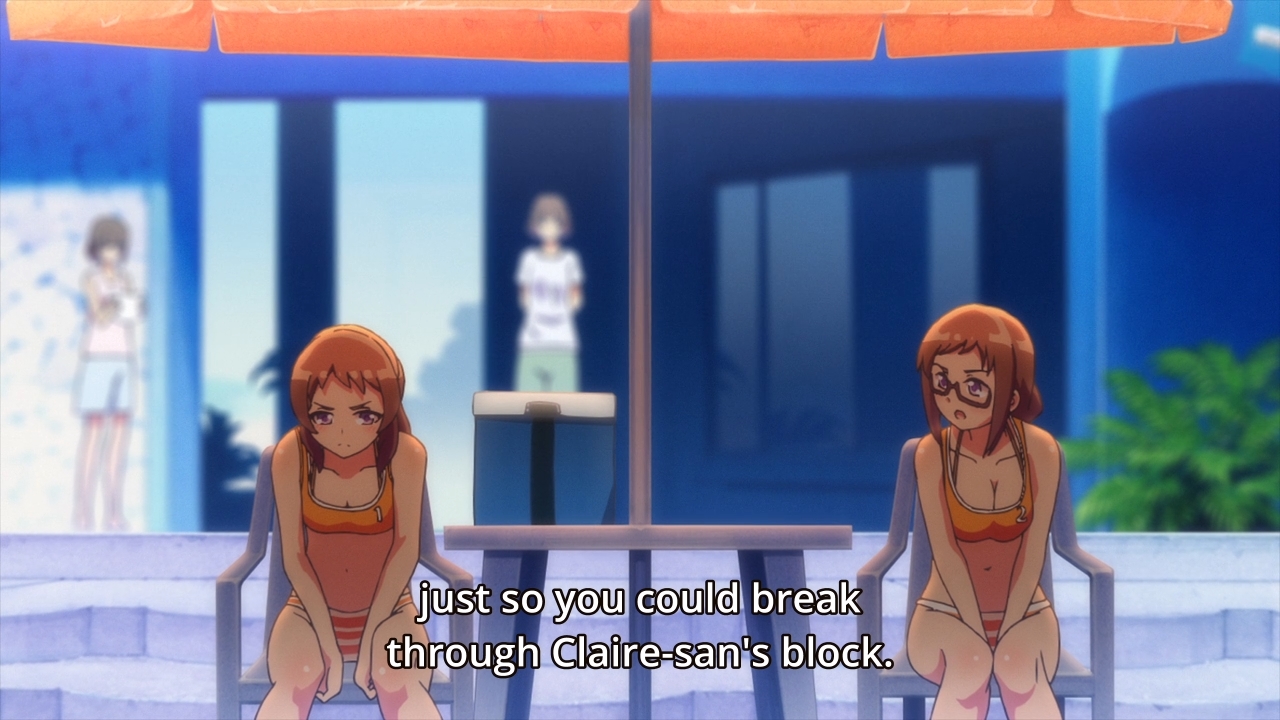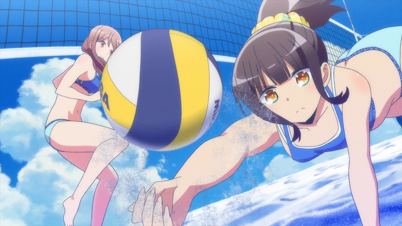 Anyways, enough of that nonsense. Even with the top spin serve, the Aragaki sisters lose in straight sets. They also lose pretty badly both times. They’re not too bothered about it, though. Hell, they probably could’ve scored more points if they weren’t so deadset on breaking Haruka’s blocks. So basically, Haruka has learned a lot from Claire, and as a result, her game mirrors the blonde twin. This is why the Aragaki sisters got so fixated with just getting pass her blocks. But Haruka still has Kanata behind her, and blah blah blah teamwork owns. And with their second win under their belt, they just have one match left: the finals against the Thomas twins. This is for all the marbles, boys. Whoops, I meant girls. Silly me, there are no boys on this island. Like I said, there isn’t much to this episode. There isn’t much to this show either. Unlike other sports anime, Harukana Receive doesn’t have the animating chops to show us the action that we desperately crave. That’s why the anime has to rely on slow motion and close-ups all the damn time. It’s just too simple.