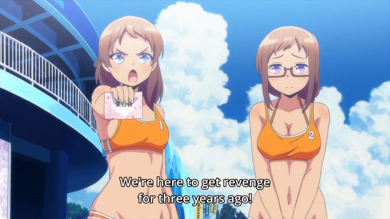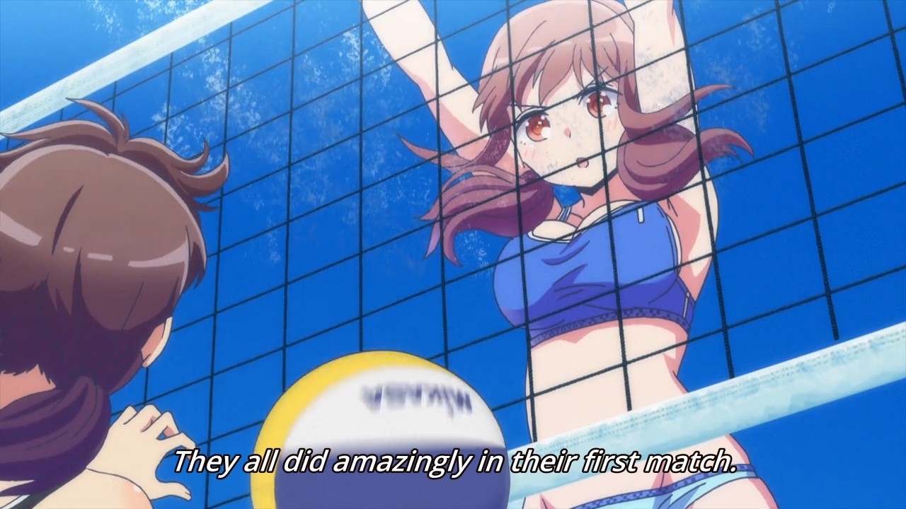 We waste the next third of the episode on tying up some loose ends. At the tournament, Kanata is pleased as a peach that she can compete in a real event. Cool. Haruka and Kanata meet up with Mai and Ai, but the latter two won’t be playing. After all, Ai has already graduated so that’s that. Maybe they can play in college or something. Our heroines then proceed to win their first match with ease. They win so easily that we don’t even get to know who they played. The opponents were simply not that important. In their second match, they get to go up against the Arakagi sisters. The Aragaki sisters had lost to the Thomas twins in middle school, so they’ve been training hard for the past few years just to get their “revenge.” But this is Harukana Receive, so there truly isn’t any bad blood between any of the girls. Plus, they’re going to have to get through Haruka and Kanata, and we already know that they won’t.