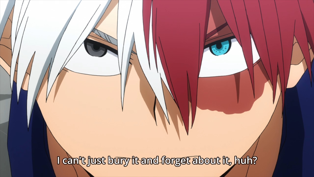 — But wait, there’s more! When both of them were still planning on enrolling at UA, Todoroki also brushed off Yoarashi’s efforts to become his friend. Unfortunately, Endeavor’s kid was still a jerk back then, so he rudely dismissed Yoarashi. When the latter looked into the former’s eyes, he saw the same “cold, cold anger!” Sorry, sorry, but I need to catch a breath, because I’m laughing too hard. The idea that you would endanger a mission just because someone has eyes of “cold, cold anger” is fucking ridiculous to me. It’s childish and petty as shit. You know how many people have to work with someone they dislike? You know how many people don’t like their jobs but still pull it together at the end of the day? So yeah, these two deserve to fail for even arguing with each other on the battlefield.