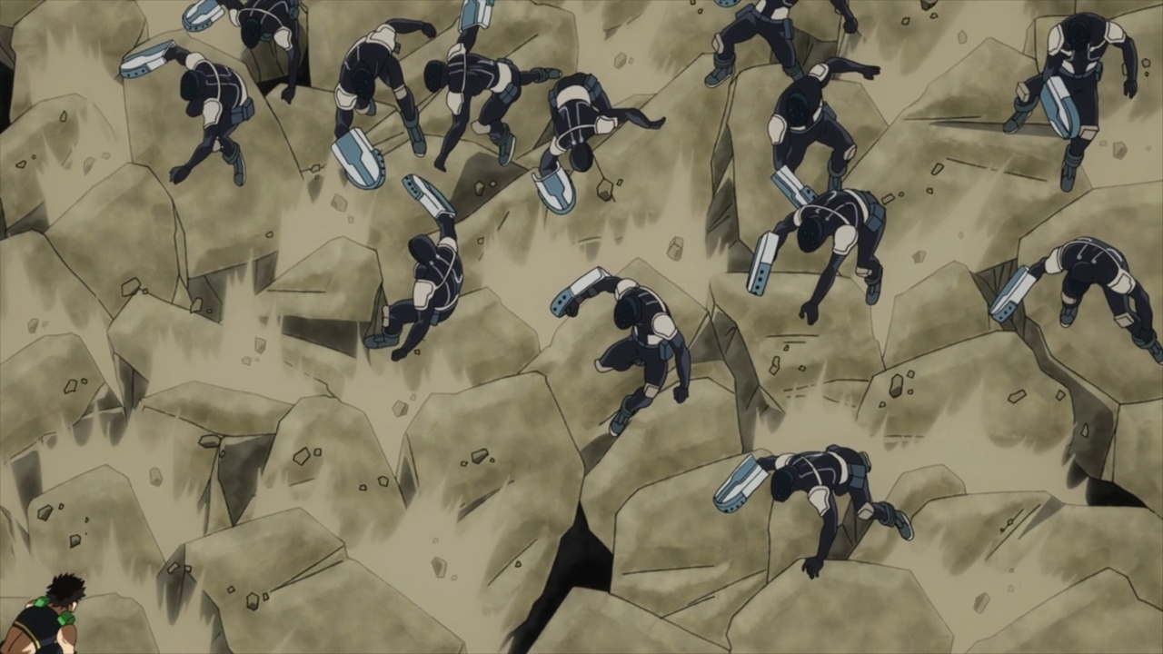 — Anyways, let’s move on. Gang Orca’s… uh, gang charges in, but Shindo immediately disables them with his ability to create tremors. Neat crowd control. Unfortunately, it won’t work on the big, bad boss himself.