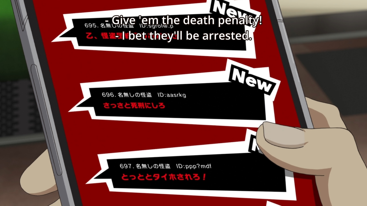 — I like that the group just walks away from Mishima in the end. He’s not that far gone. He has issues, but he can fix it himself. So back in the real world, Ren finds a contrite Mishima who will devote his energy into a new project instead. A documentary full of details about vigilantes does not exactly sound like the brightest idea, but as long as he keeps it to himself, it can’t be too bad, right? Well, in our day and age, nothing is truly secure if you stick it online.