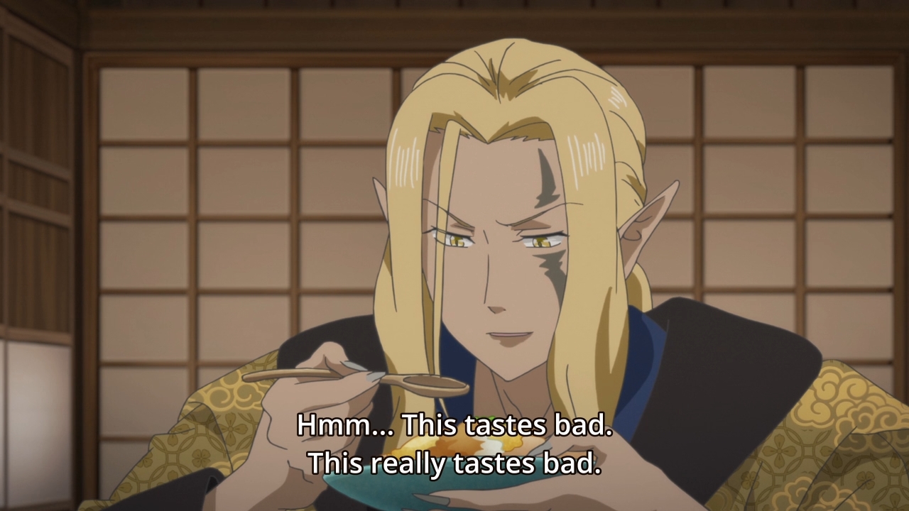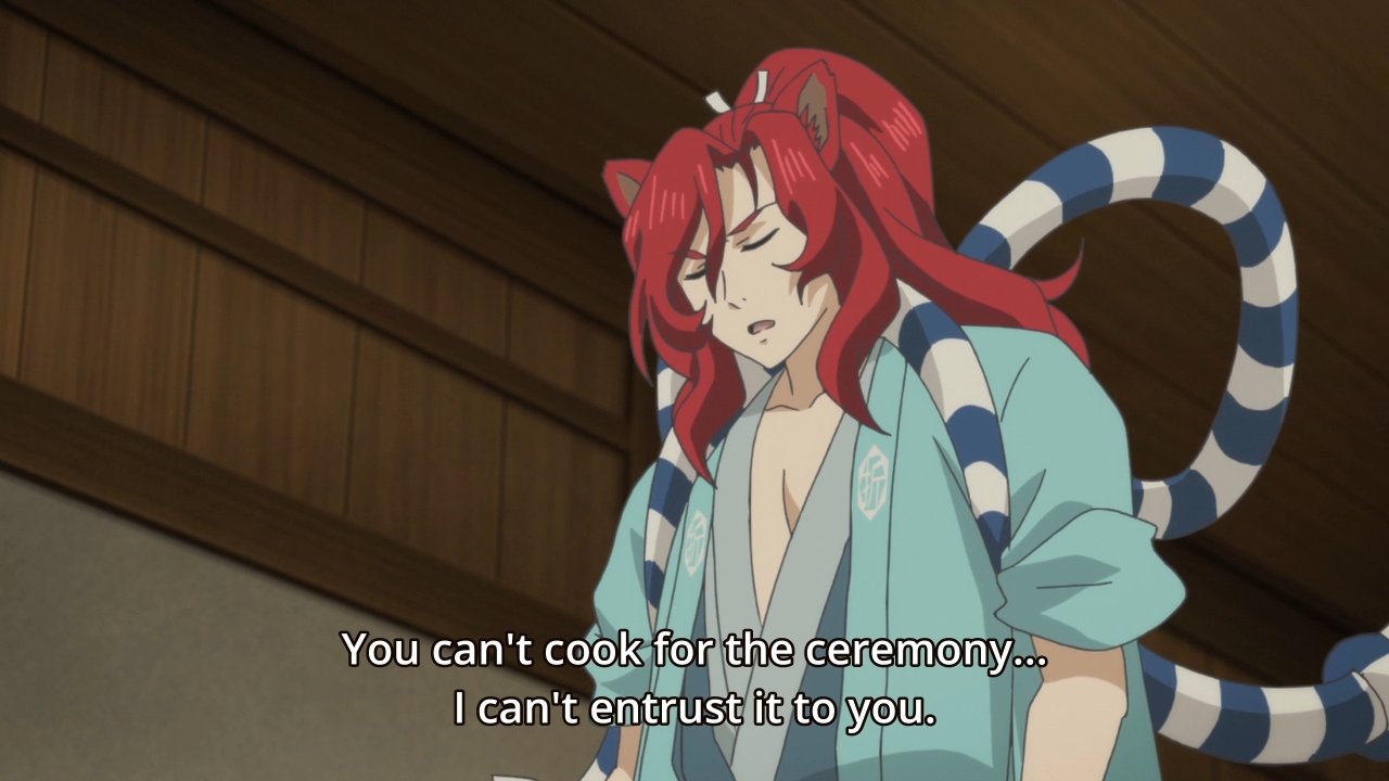 — Frustrated with her situation, our heroine gets up and tries to cook something — anything — to see if her taste is truly FUBAR. Yes, yes it is. So she goes, “I’m just someone with no real usefulness now.” Girl, that’s only true if all you can do is cook. That’s why you go to college to become a well-rounded per–… oh… oooooh. Psst, don’t drop out of school to frolic with the ayakashi. At least get your degree first, kids!