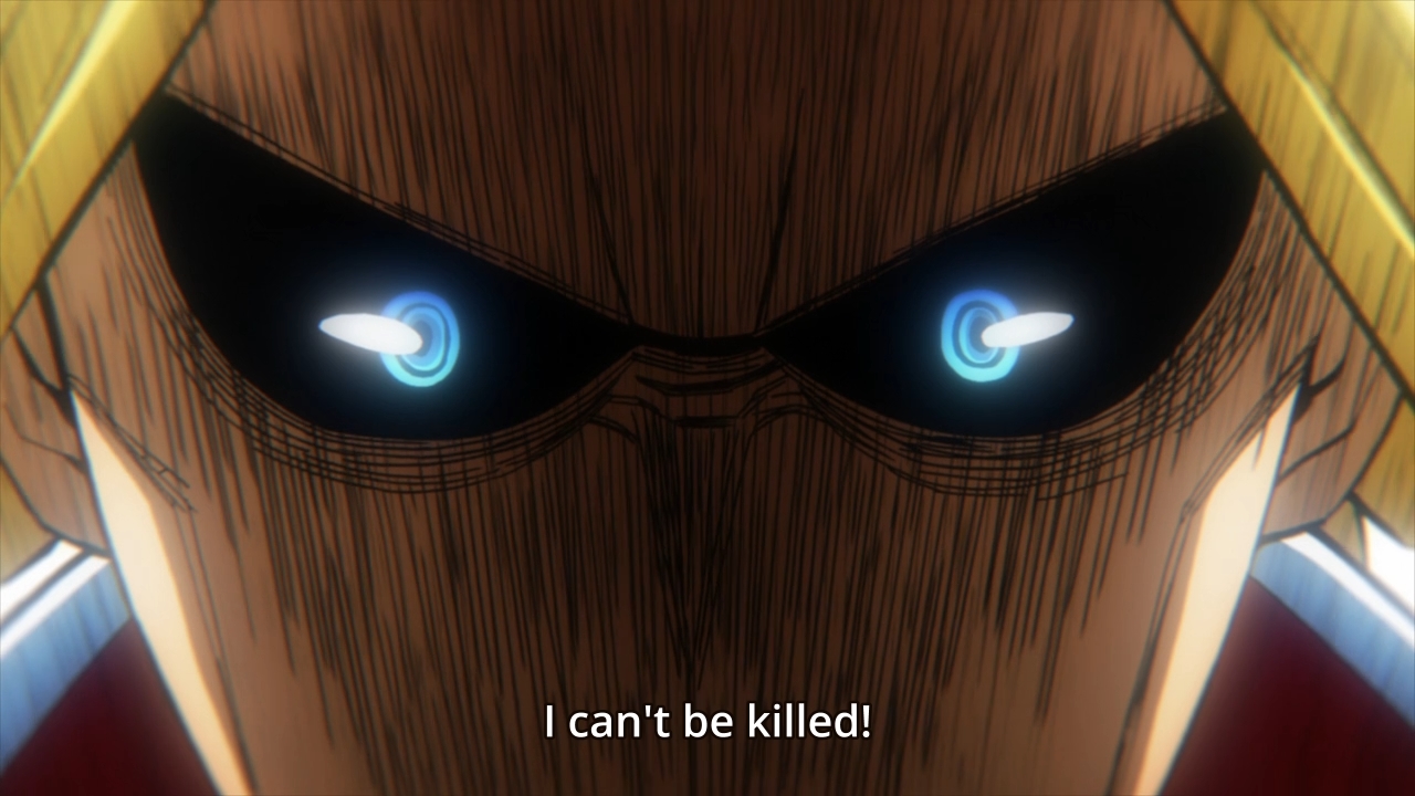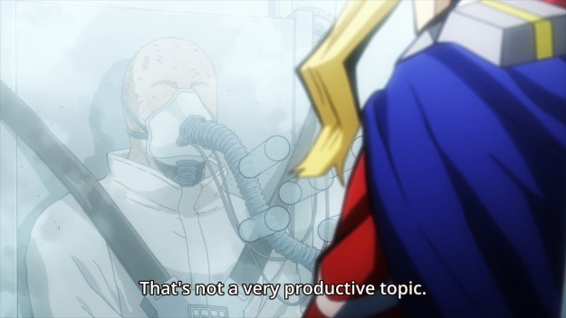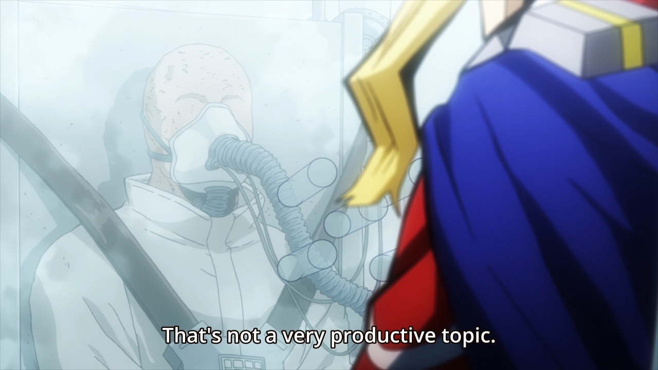— All Might was a great hero, but he wasn’t perfect. As a result, this story is just as much about him passing on his legacy as it is about Deku’s ascendancy. That’s why I find it kinda hard that All Might keeps insisting over and over that he won’t die. You will die one day, old man. In fact, from a certain point of view, you already have. You just gotta trust that Deku can fill your shoes. Maybe All Might thinks that he can’t be symbolically killed or something, which can be debated…
