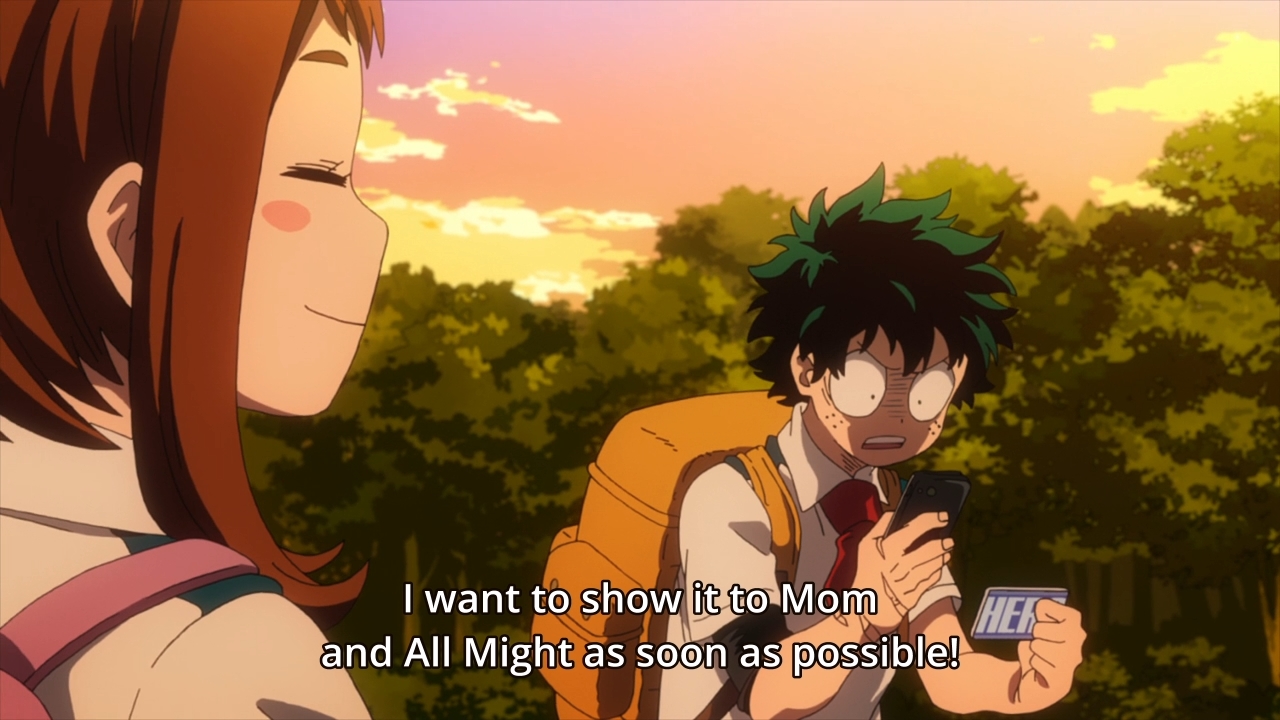 — After getting his license, Deku proudly snaps a picture to send to his parents. Oh yeah, you bet your pass All Might is included in that. He’s pretty much the kid’s dad. I was gonna say the only thing they don’t share is blood, but since Deku had to swallow the old man’s hair, he has the old man’s genetic material in him anyways. Gross.