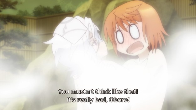 — Unfortunately, the first thing the girl sees is a half-naked Oboro doing her best to liberate Kogarashi of his precious man seed. Man, we’re all about seeds this week!