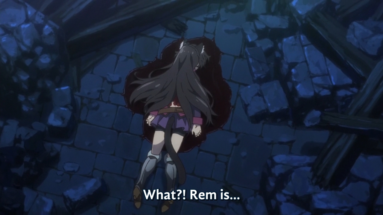 — Despite taking maybe five or six stabs in the back, Rem is somehow still alive. Well, they say cats have nine lives.