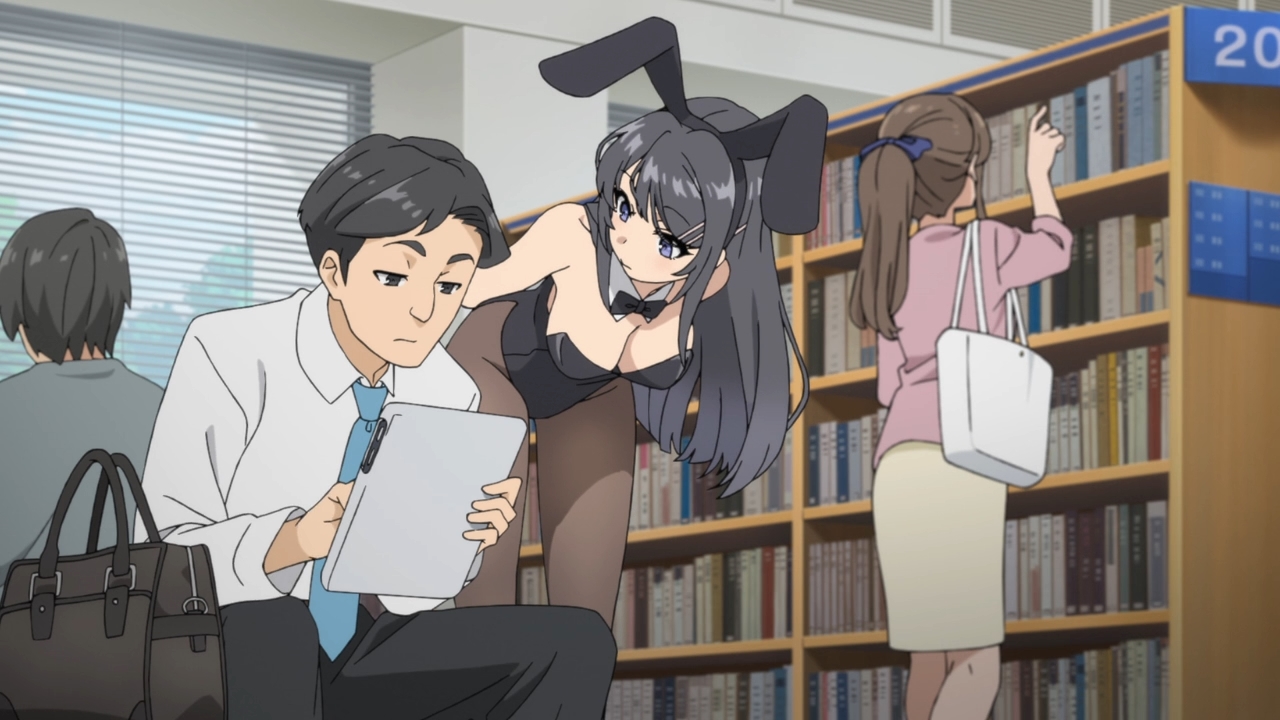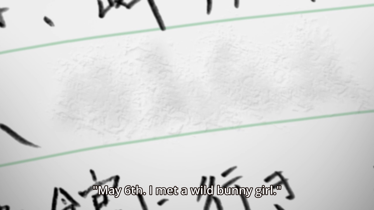 In the world of Seishun Buta Yaro, Mai is a celebrity. Or rather, she was a celebrity. Ever since she went on hiatus and wished that she could go to a world where nobody recognized her, more and more people are failing to acknowledge her existence. No, they don’t just ignore her. To some people, she literally does not exist. This strange phenomenon is also worsening with each passing day. It’s bad enough that she cannot even buy food in order to feed herself. Well, that means she can just steal whatever she needs to survive, right? But ah, that would be immoral. In any case, the girl has gotten so desperate that she has even resorted to prancing around a library in a sexy bunny suit in order to get people’s attention, but as you might expect, this doesn’t work. She hasn’t completely disappeared from the world, though. At the moment, Sakuta, the main character, can still see and interact with her. So can his best friend Yuma. Mai’s manager is also desperately trying to reach her. A couple at the train station even wanted to take a picture of her before Sakuta stepped in the way. Considering how bothered Mai is about the phenomenon, she may have wanted them to take that picture lest they eventually forget her as well. This seems to suggest that if things keep going like this, then the whole world may very well forget that Mai ever once existed. At least, that’s what the opening scene seems to imply. The main character has a diary about his experiences with Mai in case he ever forgets her, but if he forgets her, could her name literally disappear from the pages?