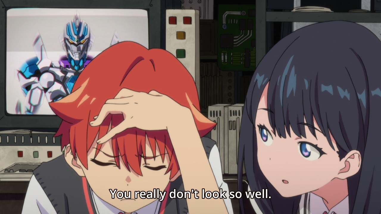— This guy is probably the villain. Well, there are two guys here, really. Someone putting together a model of a kaiju, and some robotic talking head on the screen behind said model. If the kaiju guy is destined to become Yuta’s foe, then the robotic talking head must be Gridman’s foil. But what are they after? Gotta wait and see.