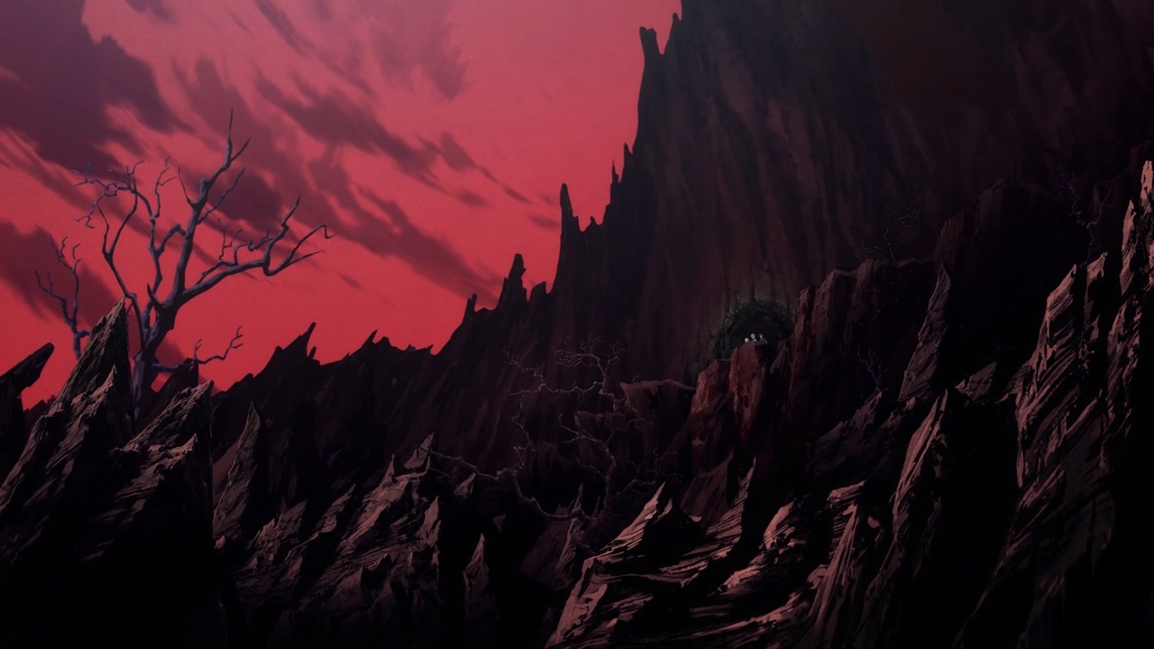— The kids eventually stumble upon the skeleton of a dead dragon. Which is bad, apparently. ‘Cause the dragon protects humanity or something. After milling around for a while — and playing with a sword that’s far too heavy for them to carry out — the kids finally fill up their basket full of ice and are ready to head home. Unfortunately, they seem to have picked the wrong path out and are thus greeted with this desolate landscape. Apparently, you have a tiny patch of habitable land surrounded by a ring of mountains. Then after walking a tiny bit through a cave, you’ll end up in the lazily-named “Dark Territory.”