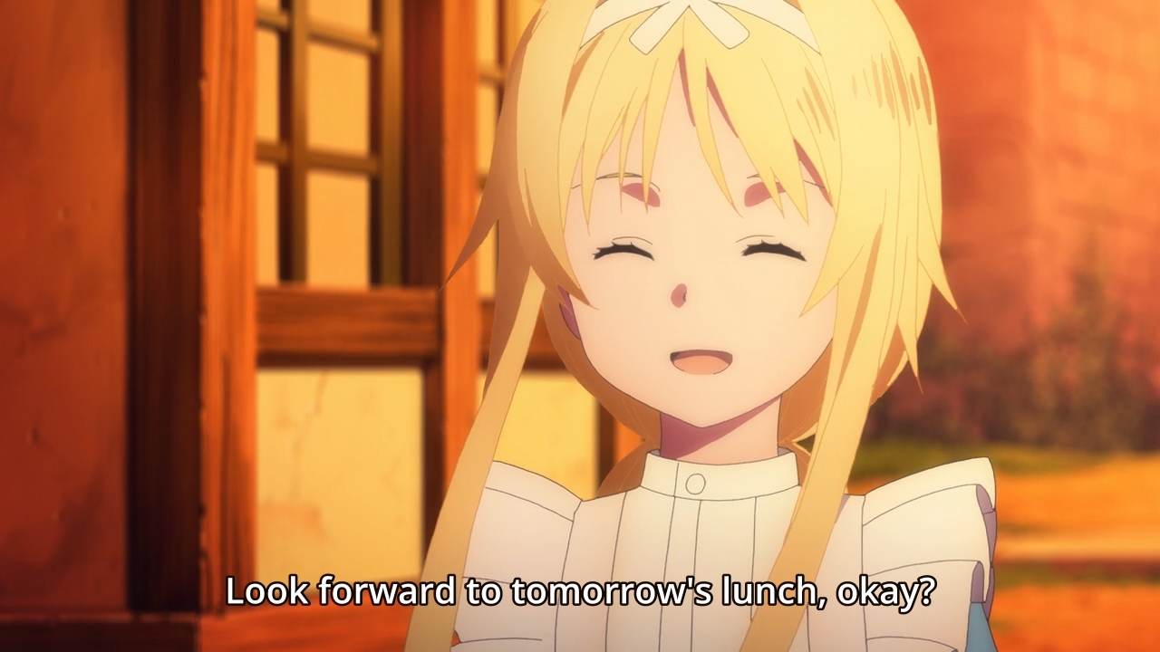 — We’re going through the motions of getting to know everyone, learning about the new world, learning about its laws and customs, blah blah blah. This is just so slow and boring. Couldn’t this wait? SAO II at least had the courtesy to open with someone dying. Despite being a side story, even SAO Alternative gave us action. Meanwhile, I’m watching a trio of kids walking along a peaceful stream, trying their best to disguise the story’s weak attempts at world-building as small talk. Yawn. We’re already nine minutes into the episode!