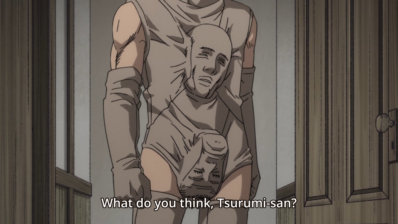 — Tsurumi wants to create fake copies of the skins in his possession, and normally, you’d have a hard time finding someone who is crazy enough to work with human skin. Luckily, this is Golden Kamuy, so there are psychopaths around every corner. Case in point, he bumps into Edogai, a mentally-deranged taxidermist who likes to dig up human bodies in order to stuff them. This includes his own mother. He hears her voice in his head like Psycho or whatever.