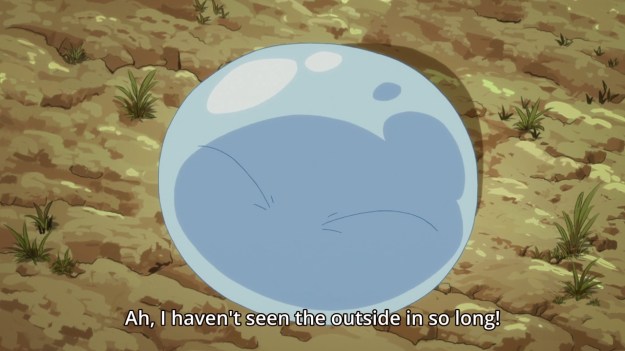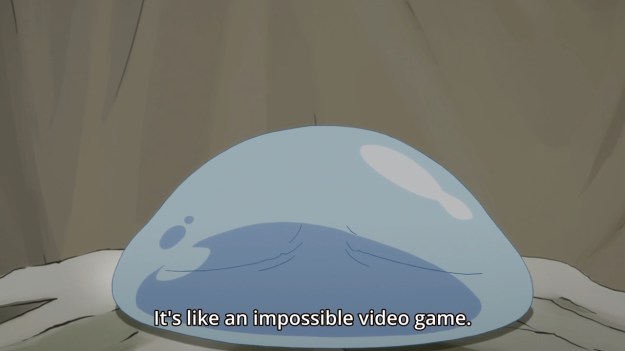 — It’s also remarkable how he doesn’t seem to mind at all that he no longer has a human body, that he may never return to his old life, that he may never see his old family and friends again (he must have had family members, no?). Maybe turning into a slime means you just don’t really have those worries anymore. I don’t need Rimuru to have an existential crisis and cry like your average mecha protagonist, but he doesn’t feel anything?