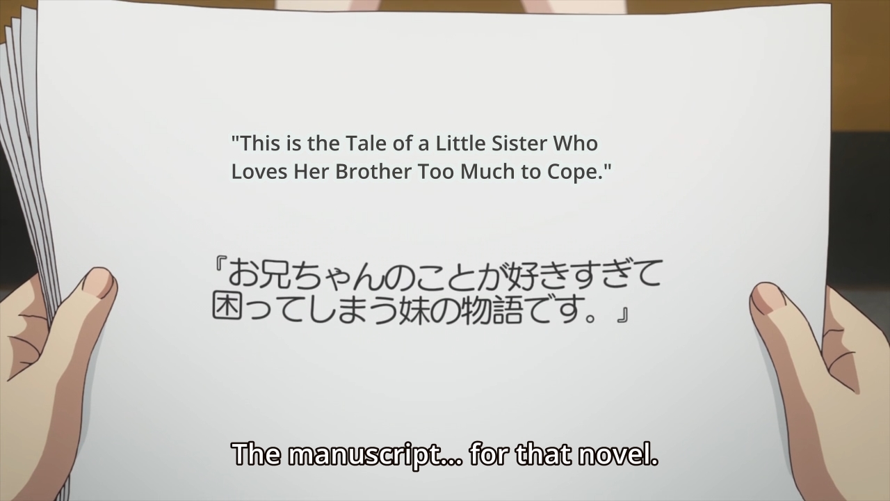 Obviously, Suzuka can’t proclaim her love for her brother to the world, because, y’know, that’s incest. Incest is wrong, and if you think otherwise, you’ve strayed too far from God’s benevolent light. But what if you could change society’s attitude towards the taboo subject? What if you could produce such a seminal piece of literature that would forever change how we as a civilization views incest! I mean, other than the crippling birth defects, what’s the harm? As a result, the girl has become an aspiring novelist. She hopes that when her light novel about a love between sibling becomes popular, then incest will become accepted, embraced, and dare I say celebrated!