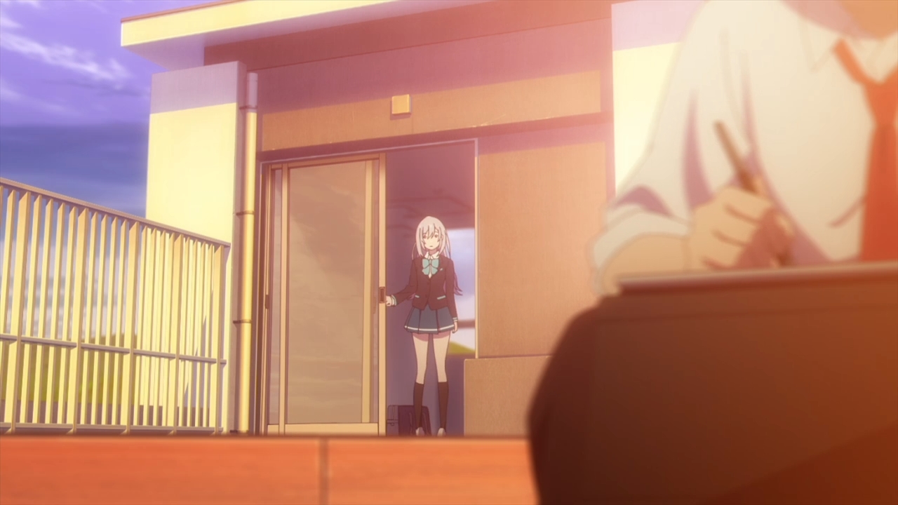 — Anyways, Hitomi is officially introduced to the photography club, but she’s not too interested in it at the moment. Rather than accompanying her newfound friends on their impromptu after school activity, we instead see Hitomi aimlessly wander the school campus until she makes her way to the school’s rooftop. After all, Kurumi had mentioned that Yuito might be there.