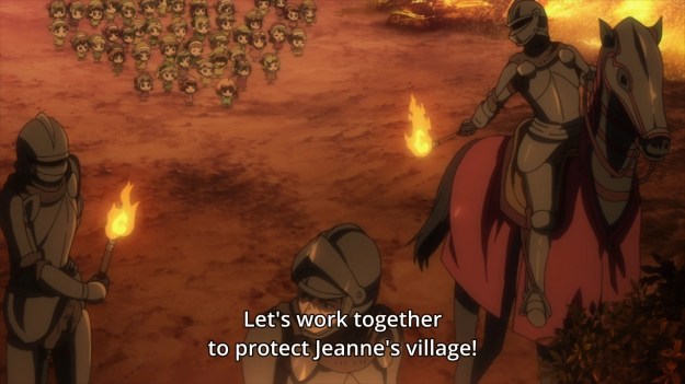— Elsewhere, La Hire is surrounded. Luckily, ditzy Jeanne has now been reborn as sassy, badass Jeanne with shounen powers! Hell, even her voice has changed. She no longer sounds like a little child. This philosopher’s stone is dope.