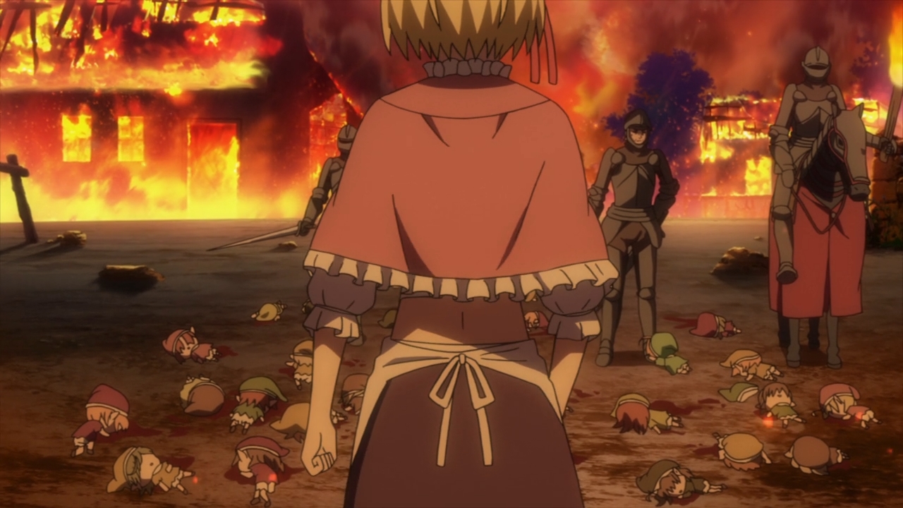— So can he finally swallow that stupid philosopher’s stone? Not necessarily, Astaroth warns. Since he’ll keep producing the elixir, she doesn’t really know how the stone will react to so much reagent. Unfortunately, any further discussion is immediately tabled, because the real bad guys are here to wreck the village.