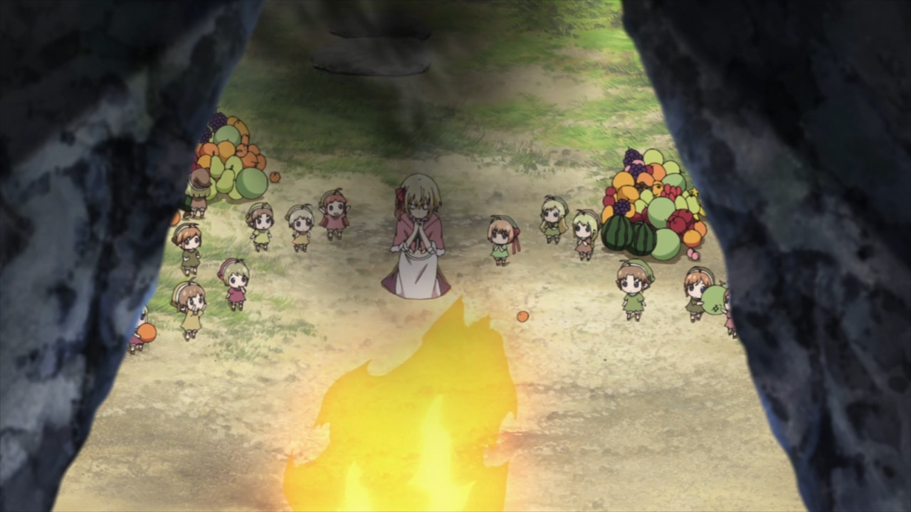 — For some reason, she and the fairies are praying while burning fruit at the site of some ruins. What a waste of perfectly good food.
