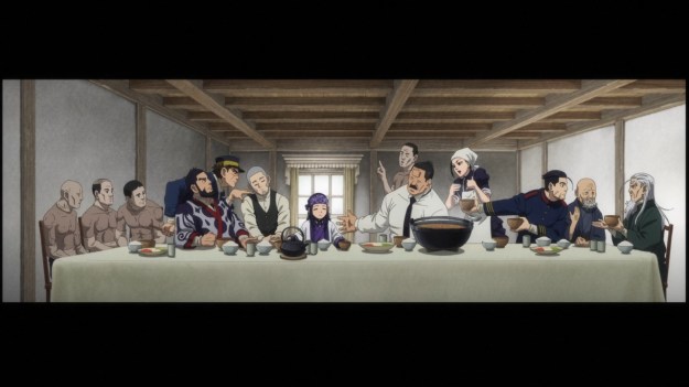 Yep, that’s The Last Supper featuring four skinned corpses. This show just gets quirkier and quirkier. Well, the creepy taxidermist is dead, but he still managed to get five fake skins out to Tsurumi before breathing his last breath. Meanwhile, Sugimoto and Hijikata nearly come to blows, but luckily, someone’s (Asirpa’s?) rumbling stomach temporarily saves the day. Honestly, I don’t really have much else to say. I wouldn’t necessarily say that major plot stuff happened in this week’s episode. More like hijinks happened. Hijinks involving a high-speed chase in a mine cart and a massive explosion that nearly takes both Sugimoto and Shiraishi out. They should thank their lucky stars that Chinpo-sensei was there to rescue them. In the end, we killed some time, but I feel no closer to any sort of resolution.