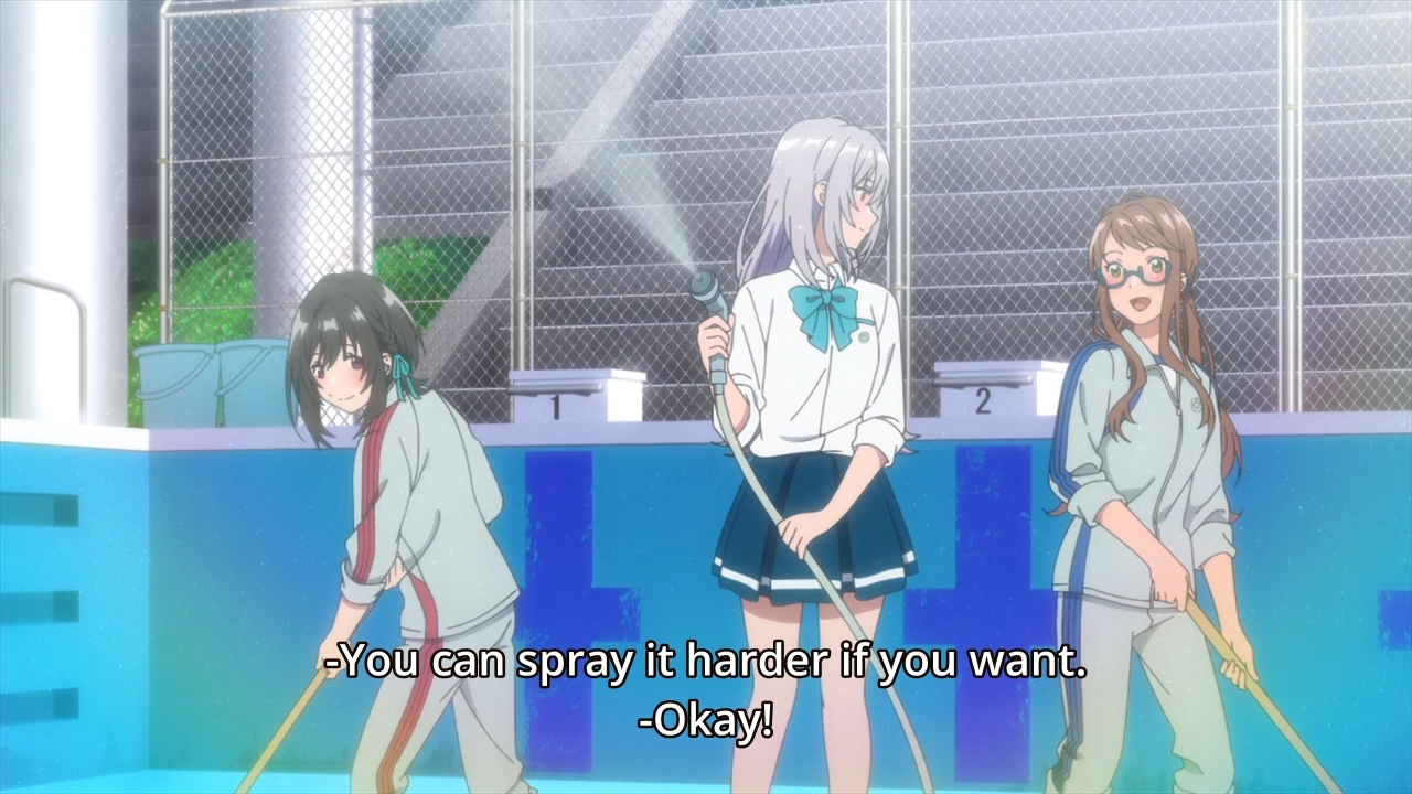 — Apparently, the Photography Arts Club are being punished for misusing the pool. Even so, Hitomi will help them clean the whole thing. They don’t have a spare outfit for her, so the poor girl has to clean in her school uniform.