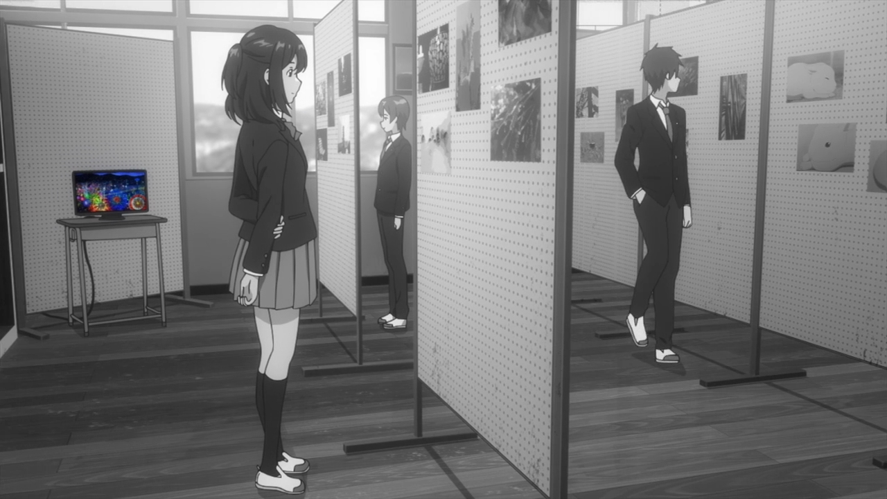 — Yuito sees a rainbow in the sky, which reminds him of Hitomi’s inability to see colors. He then brings up the fact that Sho takes monochromatic photos, which is something that Hitomi should have no issues with. Before anyone could even invite her, our heroine blurts out that she would like to join the club. Well, that’s that, I suppose.