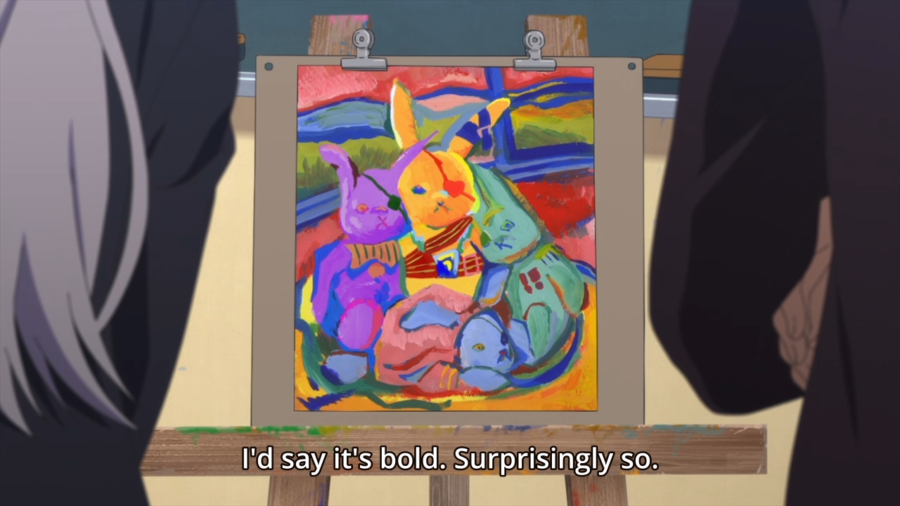— Despite Hitomi’s utter lack of confidence, she still manages to produce something that impresses Yuito. In fact, he’s in awe of her use of colors. This can’t be her first time painting. I’ll bet you anything that something in her past must have scared her away from it.