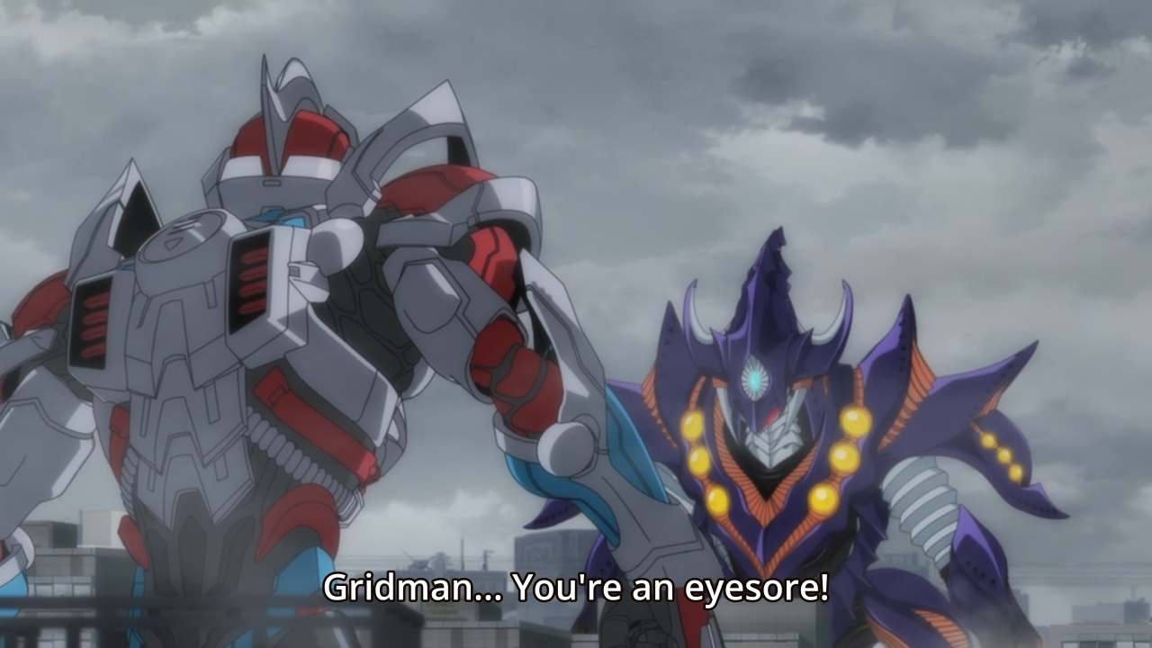 — In the middle of battle, Gridman leans in and asks if Anti is human. Nope, Anti says. He’s all kaiju, baby! And with that, Yuta can now fight with a clear conscience. I don’t think this is a satisfactory resolution, though. So if Anti really was a person, then it’s okay for Yuta to hesitate? I mean, shouldn’t he fight anyways to protect his friends? Plus, what even makes Anti not human? He can talk. He can think. He can eat. Just because he can turn into a kaiju doesn’t take away from the fact that he’s incredibly human-like. Ah, whatever.
