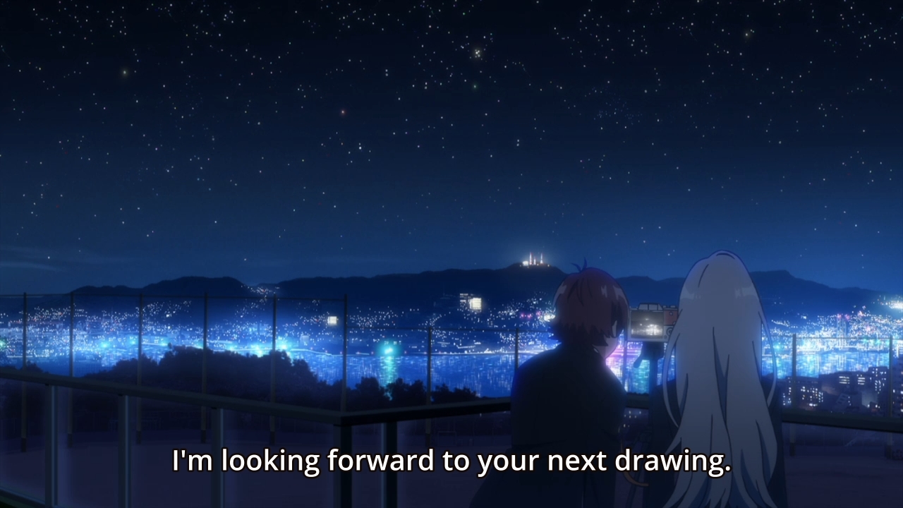 — Unfortunately, he has such a flat response to her request. First, it takes Yuito a while to even reply to Hitomi, then he just kinda stares off into the distance. It’s almost as if he answered because he felt obligated to, but on the inside, he’s wrestling with something he won’t reveal to us just yet. What does his art mean to him and why does he feel so reluctant to share it? And if his art is that personal, why does it look so generic?