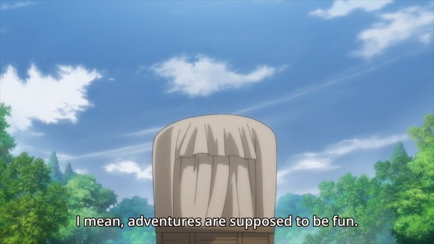 — Plus, she acts like this is all Goblin Slayer’s fault or something — like he deliberately sucked the fun out of the quest for her. Could he have been nicer to her? Yeah. But when you go into a goblin’s sex dungeon, I don’t know what you expected to find. Cute, little animals and exotic culture? Get outta here.