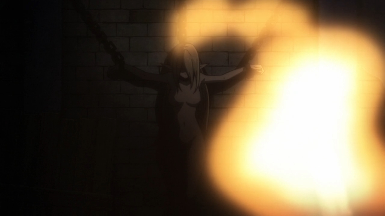— The party eventually stumbles upon a room where the goblins do their business. And of course, the place has a naked elven girl all chained up. She has obviously been tortured and mistreated. Priestess wants to heal the woman, but Goblin Slayer steps forward with his sword as though he’s going to put the victim out of her misery. But it turns out he only wanted to slay a goblin! Haha, oh Goblin Slayer!