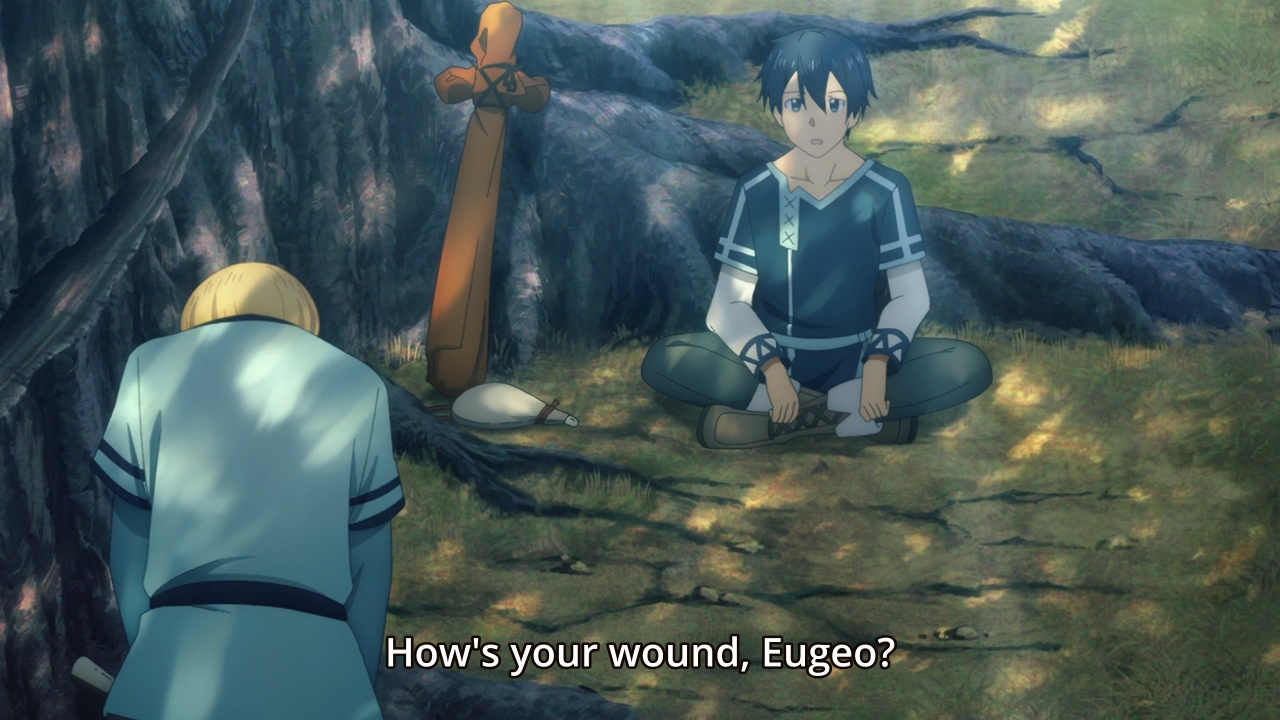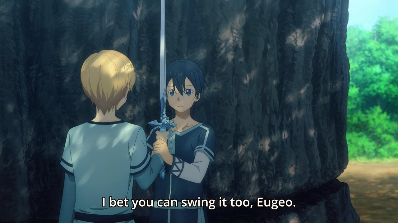 — Kirito asks Eugeo about memories of their childhood, but the latter is now back to being skeptical. He also didn’t hear Alice’s voice at all during the whole healing incident. As a result, our hero decides to keep it to himself for now. Yeah, yeah, I know. You guys are bored too, so let’s get back to the exciting stuff like chopping down this tree!