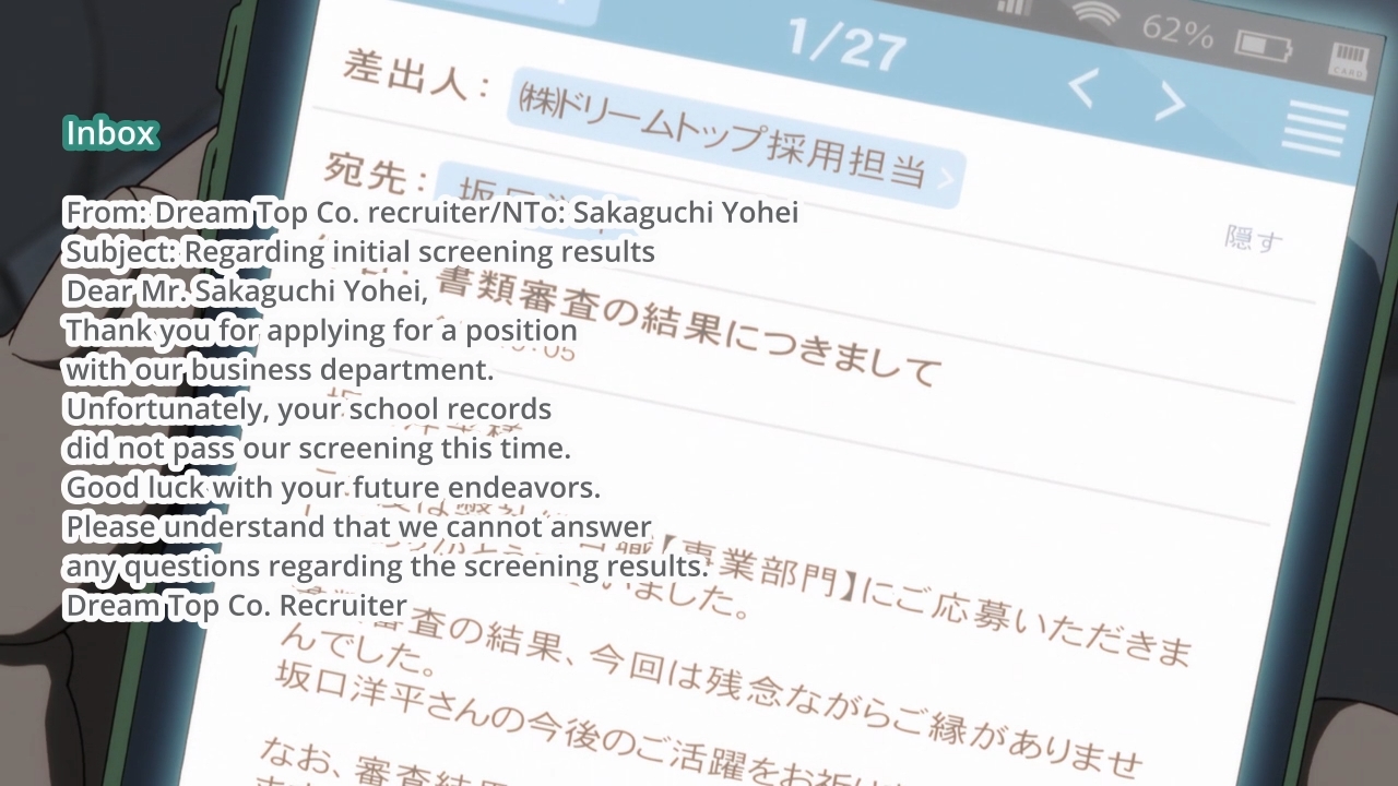 Okay, I’m slowly beginning to learn these characters’ names, and King is the guy who desperately wants to land a job. As a result, it sounds like he’s been attending job fairs non-stop. When the other guys are busy running, he’s either applying to jobs or waiting nervously for good news to come his way. Unfortunately, the guy isn’t having much luck. It’s a dog-eat-dog world out there, and if you don’t come already equipped with top qualifications, then you better go back to the drawing board. But y’know what? Maybe luck doesn’t have anything to do with it. Maybe, as they say, you gotta make your own luck. After all, it would be insane to do nothing and expect different results. Unfortunately, when you’re busy looking for a job, it’s easy to fall into that trap. It’s easy to think that you’re trying your hardest when, in actuality, you’re just allowing time to pass by without beefing up your resume at all. I don’t really agree with Haiji’s tactics, but now more than ever, King should embrace the opportunity to compete in the Hakone Ekiden rather than being dismissive. After all, what has he got to lose? More importantly, what’s more impressive than an amateur runner working their way to the very top of the sport? Effort is attractive, kids. A recent paper even supports this conclusion.
