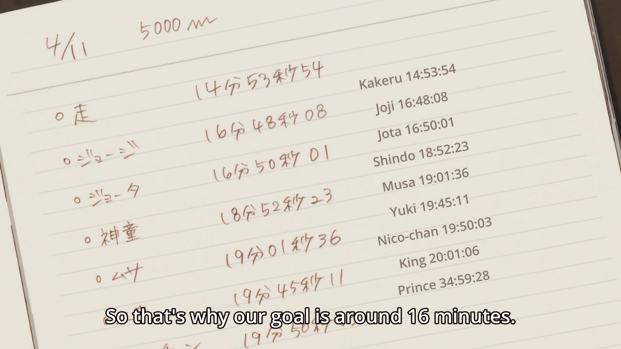— But of course, Kakeru still has his concerns. For instance, he thinks it’s too soon for the group to compete in a track meet. He thinks it should take a few more months before they’re ready. I don’t think he wants his newfound friends to get discouraged. They’ll be up against athletes who have been training for years, not just a few weeks. And if you lose badly in front of a crowd, well, you might feel defeated. I get where he is coming from. After all, look at the boys’ times. They’ve got a lot of work cut out for them.