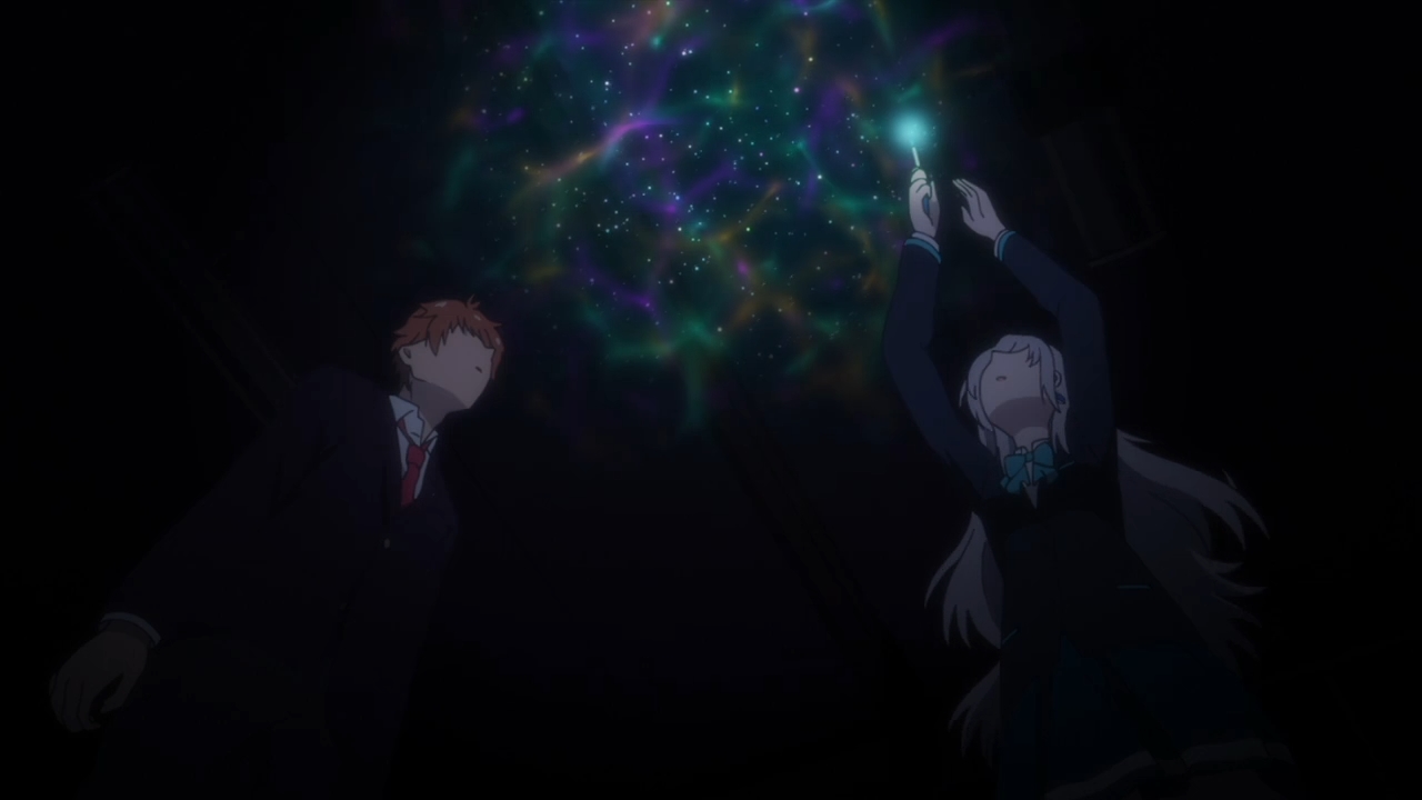 — In the privacy of his room, Yuito uses Hitomi’s star-sand, and what he ends up seeing is very reminiscent of what Hitomi saw when she gazed at his last drawing. In a way, I guess this helps him understand her a little better.