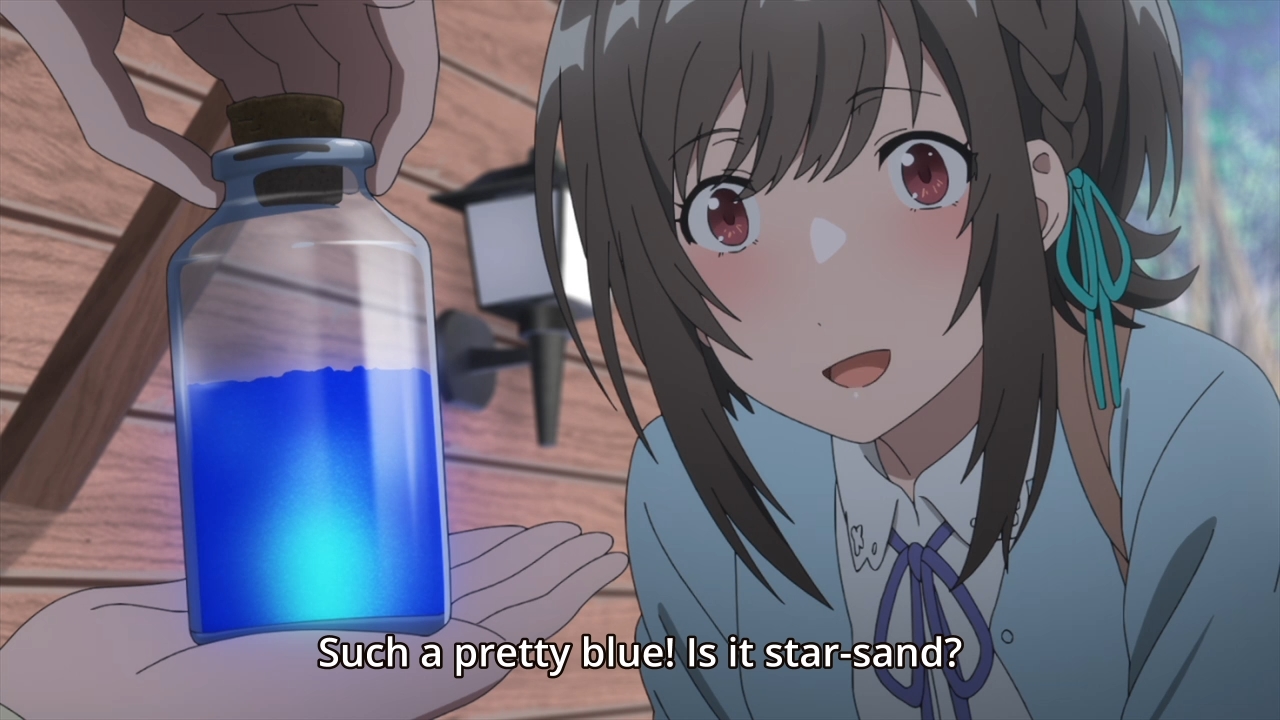 — The girl can’t help but ask about Yuito’s next drawing, but he hasn’t had much inspiration lately. He thus jokingly wonders if there’s star-sand that would help him out in that regard. He ends up telling her that he’s just “musing,” but that’s not going to stop Hitomi from fulfilling her quest.
