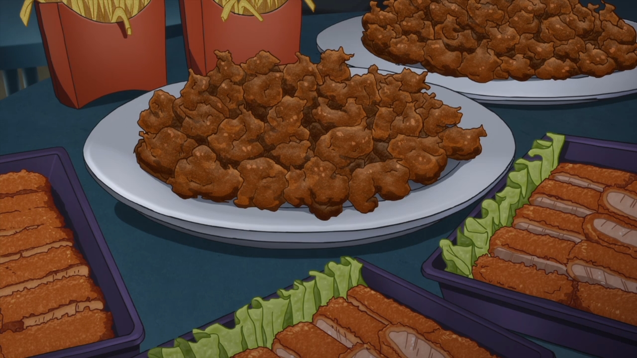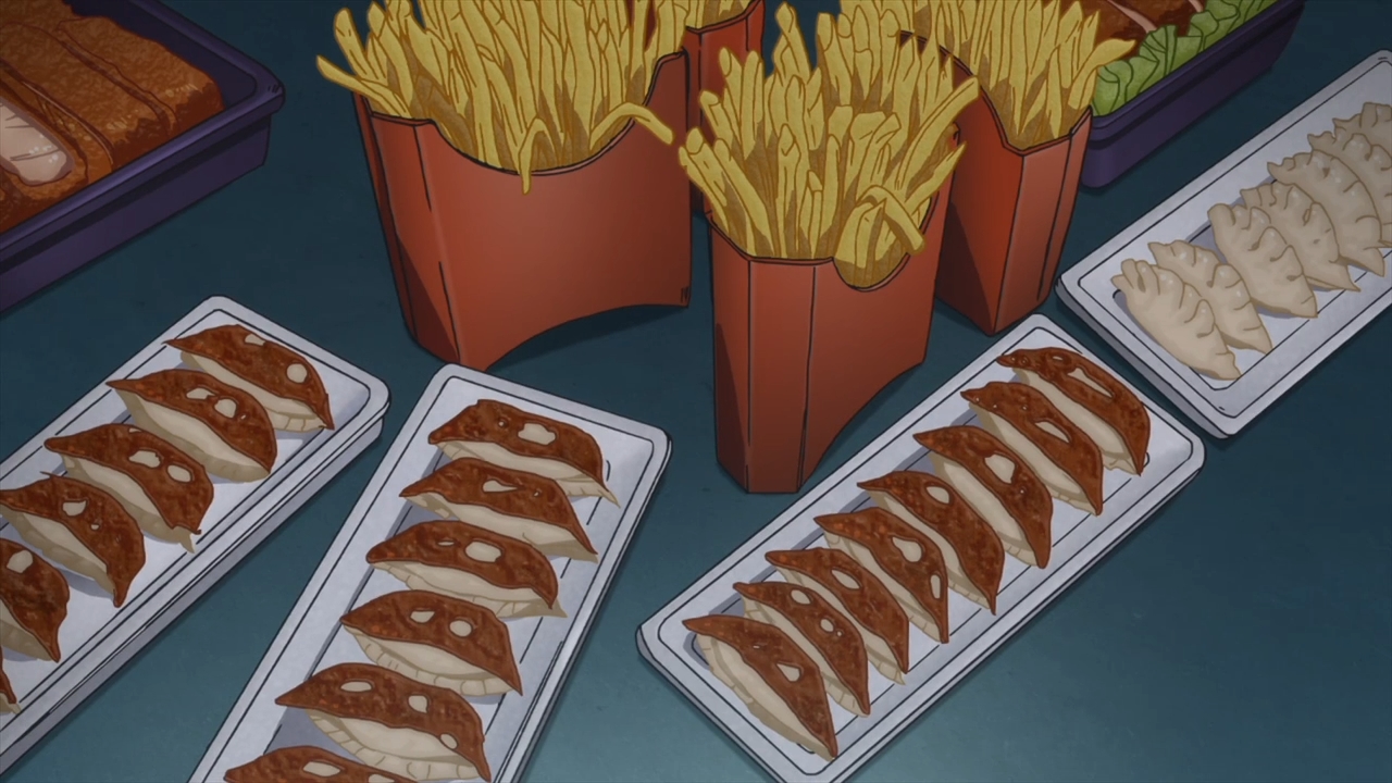 — Hitomi set up all these dainty tea cups, and Asagi brought rabbit-shaped cookies for the party. As for the rest? Gyoza, french fries, and a whole bunch of other fried foods. I just think the contrast is funny, but I gotta give them thumbs-up on this one. I’m not very keen on tea and biscuits. Gimme those gyoza.