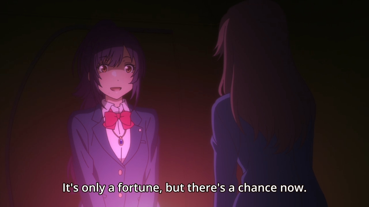 — Our resident mage and fortune teller gives the sad girl a pep-talk. She assures Asagi that we are all ultimately responsible for our own futures, so nothing is set in stone. Plus, Hitomi doesn’t even like Sho, and it takes two to tango. I know strong emotions are usually irrational, but if Asagi would just pause and think for a second, she should realize that even if Sho goes for Hitomi, it’s not like he would automatically win her heart.