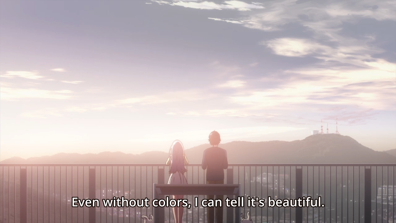 — Midway through their juice-buying adventures, Yuito takes Hitomi to see a nice view of the city. Eh, what can I say? It’s a city. But to these anime characters, it is one amazing spectacle. And as a result, this is the perfect moment for Hitomi to hand over her star-sand.