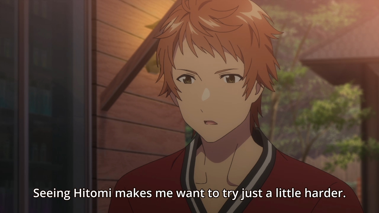 — Meanwhile at the party, Sho can’t help but talk about Hitomi even though she’s not there. He’s going on and on about how our heroine has him all motivated to seize his future! He then tells Asagi to step it up, which really pisses the girl off. She also resents the fact that he seemingly went all out for this party just for Hitomi and Hitomi alone. It doesn’t really matter if this is true or not. What matters is that she feels hurt and neglected by her best friend ever since the new girl showed up. Asagi eventually storms away from the table, and sadly, Sho doesn’t even bother to chase after her. Kinda weird for childhood friends, don’t you think?
