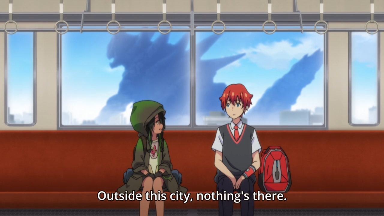 — On the train, the little girl continues to explain everything. What is Akane doing? She’s creating kaiju in order to correct this world. This apparently kaiju-shaped world that she created somehow with her own bare hands (okay, maybe not her bare hands…). This world that only seemingly consists of the city and its inhabitants. This world that she doesn’t even like! Remember, she hates going outside!