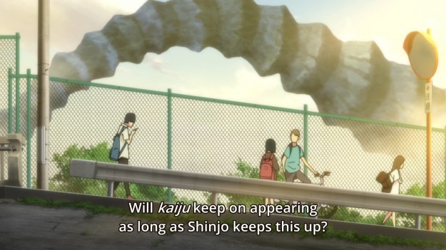 — Now the story is being all meta, because we now hear Akane telling Sho that “they” shouldn’t be making episodes without kaiju in them. Technically, Anti and Yuta’s new friend are both kaiju, but neither of them have transformed into their kaiju forms.